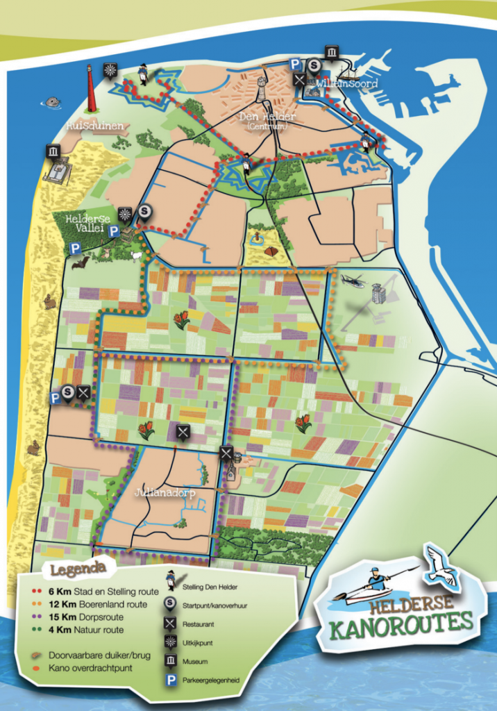 De Helderse Vallei is het vertrekpunt van de 4 goed aangegeven kanoroutes die Den Helder rijk is, met onderweg diverse aanlegsteigers. Daarnaast heeft Den Helder diverse watergangen die goed toegankelijk voor kano’s zijn.